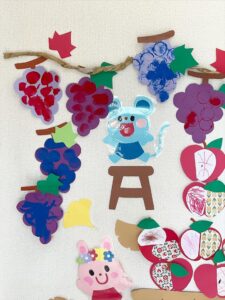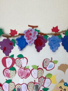ぶどうの実は絵の具でぬったり、トイレットペーパーの芯を使ってスタンプしました♪